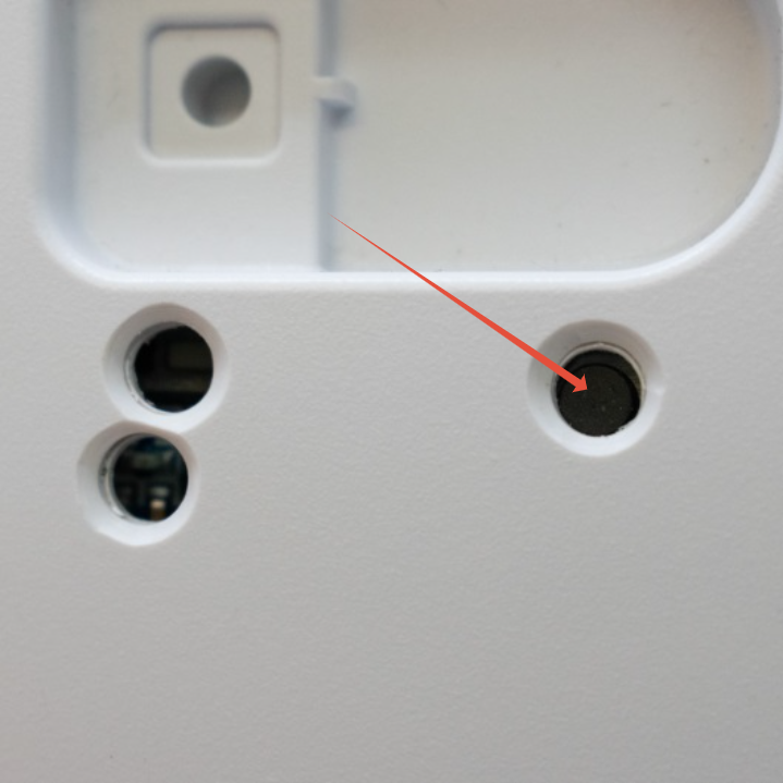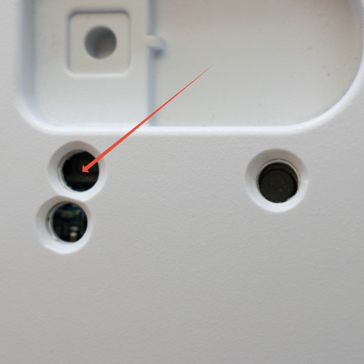 Appuyez ensuite brièvement une fois sur le petit bouton gris clair situé dans le deuxième trou à l'arrière du boîtier.